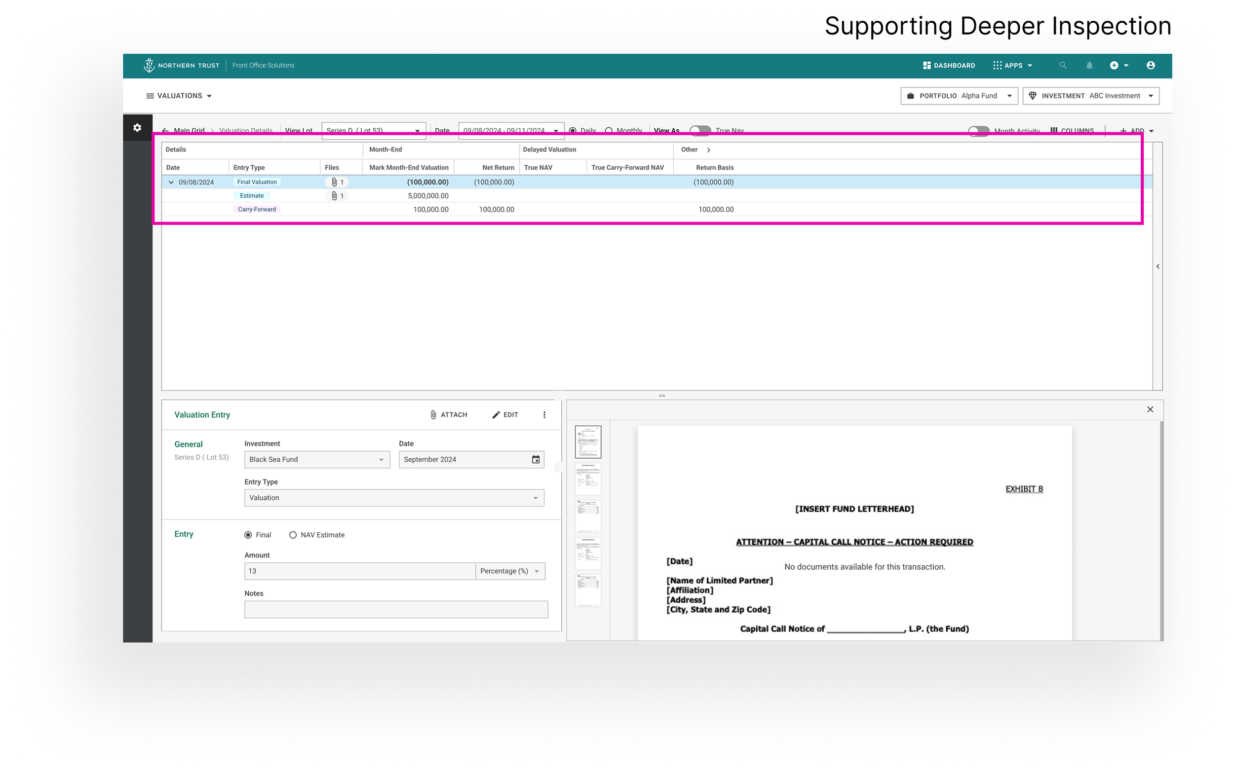 The valuation grid is the primary interface for monitoring investment valuations.